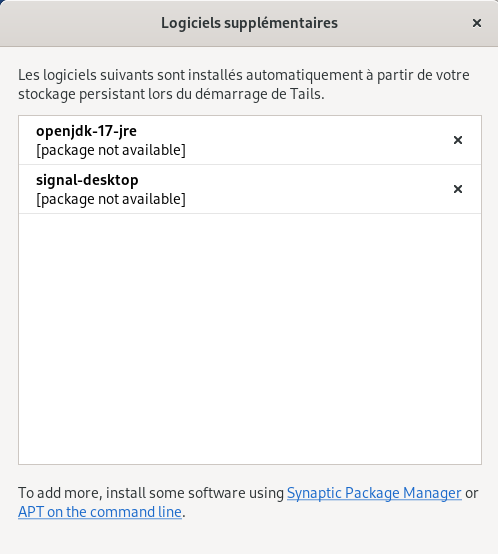 Si c'est le cas, ouvre Apps > Tails > Additional Software et pour chaque application qui porte le message "Package not available", note son nom et appuie sur la croix pour la supprimer.